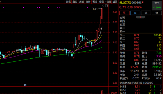 9月24日以来,德龙汇能股价持续上涨,累计涨幅约37.82%。10月24日,公司股价涨停。