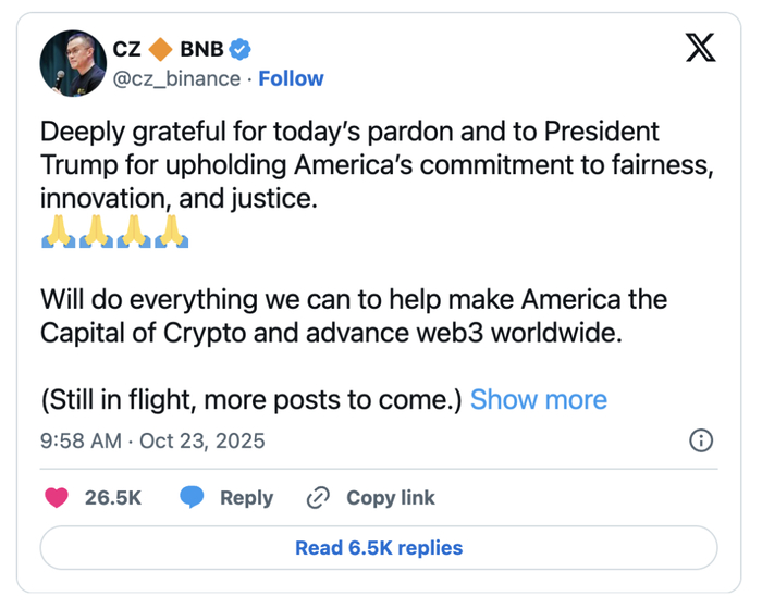 被赦免的CZ,也立刻“感恩戴德”,发了个小作文,说懂王牛逼,美利坚灯塔,人类的希望,我愿为美国成为“全球加密货币之都”,肝脑涂地。