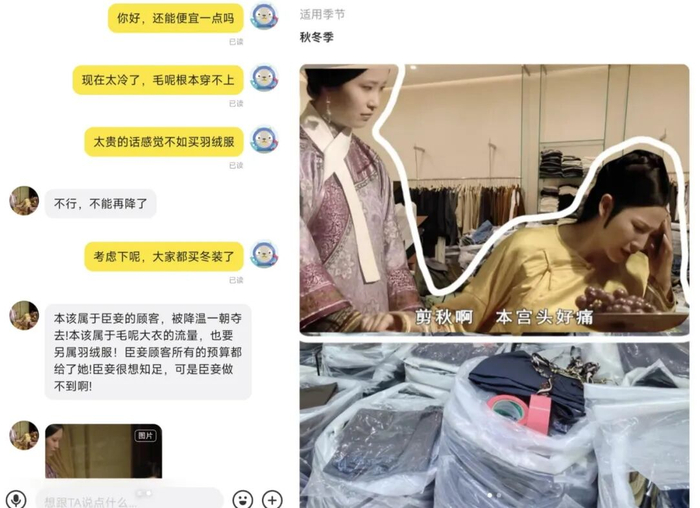 各路网友前来围观,“剪秋文学体”也随之走红。而搞抽象这事儿,最容易出现人传人的现象。这下,在闲鱼卖羽绒服、秋衣秋裤的店家们也都戏瘾大发,跟年轻买家们玩起了“甄嬛传”式对话,演着演着就把自己商品卖出去了。