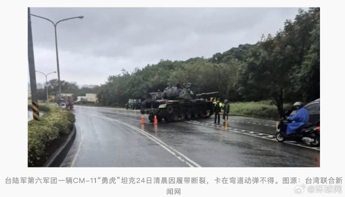 就在3天前,台陆军“勇虎”坦克刚被曝出履带断裂事故。据联合新闻网10月24日报道,台陆军第六军团一辆CM-11“勇虎”坦克,当日清晨5时左右行驶经过新竹县台1线一处下坡路段时,因履带突然断裂,坦克卡在弯道动弹不得。由于坦克体型庞大,引起不少民众注目,台军方出动大型吊车排除。台陆军六军团对此表示,执行演练期间任何突发状况,都视为训练环节,均有助于士兵累积实战经验及整体战力提升。