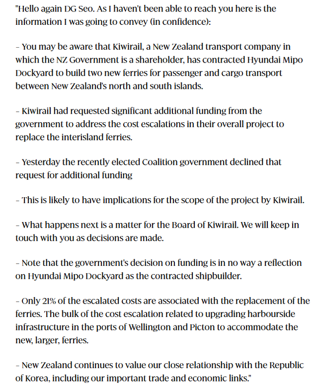 这里有个很有意思的插曲,韩国方面直到新西兰财政部长公开宣布取消iReX前一个小时,才收到了新西兰外交和贸易外交部发来的两条短信。根据《邮报》的报道,这两条短信由新西兰驻韩国大使道恩·贝内特发给了韩国高级官员、亚太事务总干事徐民中(音译)。第一条的大概内容是,你好,我有个大事儿想跟你说,你方不方便接电话?眼见半个小时没回复,这才又发去了第二条,我们很抱歉的通知你,新政府把造船的项目取消了。