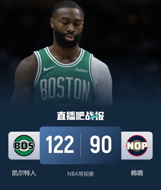 一开场,凯尔特人内外开花打出15-5的开局,鹈鹕连投带罚努力追赶,杰伦-布朗延续火热状态,次节小乔丹连续暴扣得手,鹈鹕趁势迫近比分,米诺特和加尔扎联手拿分稳住局势,半场战罢凯尔特人65-54领先鹈鹕。下半场,鹈鹕奋力反击打出10-2的攻击波缩小分差,凯尔特人多点开花稳住局势,末节凯尔特人突然发力,连中三分轰出17-2一举将分差拉开到20分以上杀死比赛。最终,绿军122-90击败鹈鹕,拿到赛季首胜。