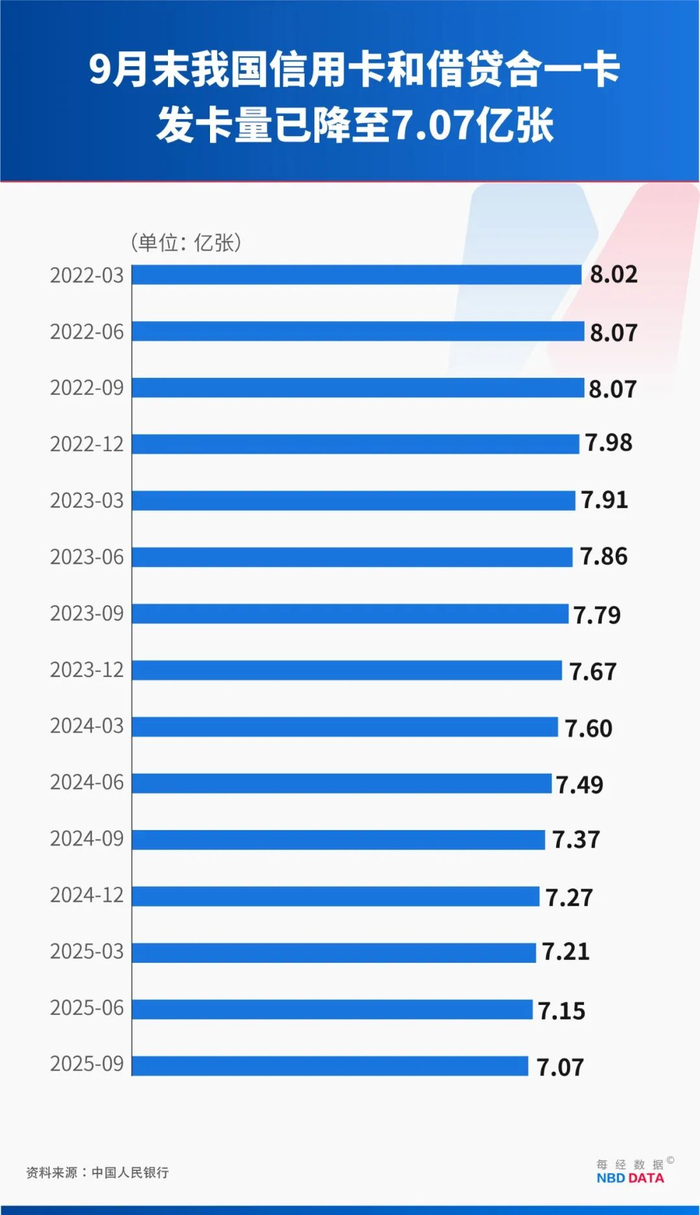 据央行近日发布的2025年第三季度支付体系运行总体情况,截至三季度末,全国共开立信用卡和借贷合一卡7.07亿张。记者注意到,这一数据较上季度减少800万张,较去年末减少2000万张,较2022年的历史峰值8.07亿张更是减少了1亿张。