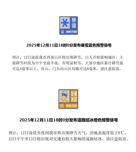 央视网消息:据北京市气象局消息,北京市发布暴雪蓝色预警、道路结冰橙色预警。