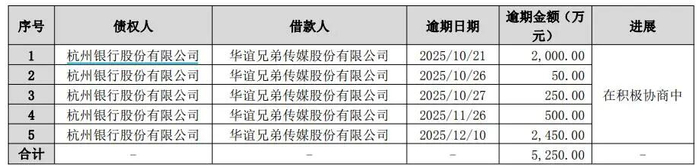 经华谊兄弟相关部门统计核实,截至2025年12月10日,公司在银行等金融机构逾期债务合计为5250万元,超过公司2024年经审计净资产的10%。