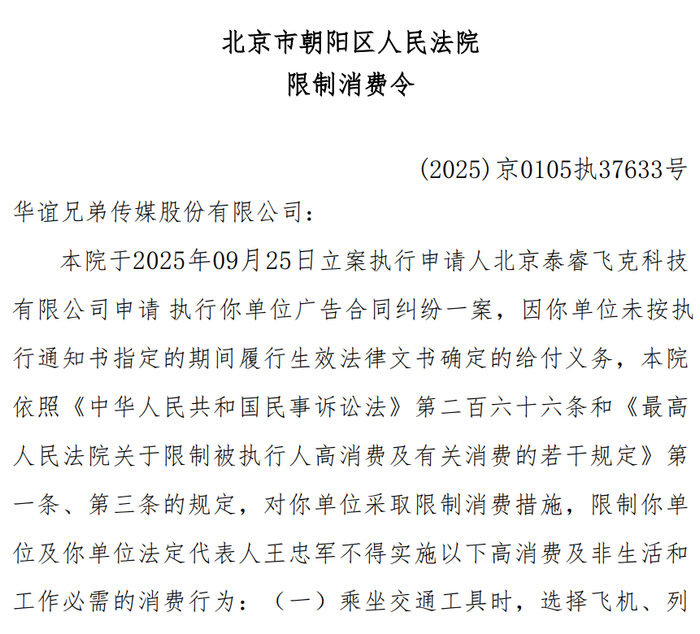 天眼查显示,近日,华谊兄弟传媒股份有限公司(华谊兄弟,300027.SZ)及其法定代表人王忠军(王中军)新增一则限制消费令,涉及广告合同纠纷案件,申请人为北京泰睿飞克科技有限公司,执行法院为北京市朝阳区人民法院。