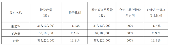 截至目前,王中军、王中磊两兄弟所持股份累计被冻结的比例已经达到100%,被冻结股份占公司总股本的比例合计为13.81%。