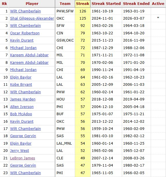 这样,亚历山大连续126场砍下至少20分,追平张伯伦的NBA历史纪录。