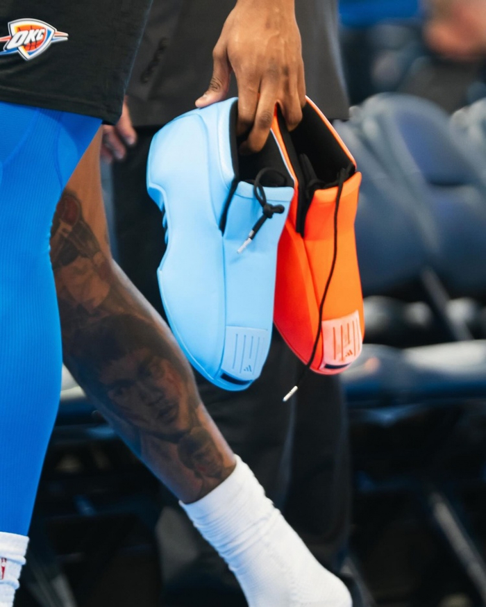 今天缺席比赛的杰伦·威廉姆斯在赛前也进行了常规训练。而他上脚了一双Adidas Crazy 2 “OKC” PE。球鞋采用了雷霆球衣配色的蓝橙鸳鸯配色。