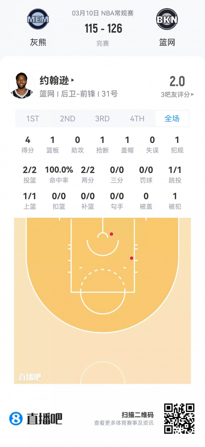 篮网落选秀钱尼·约翰逊 登场4.9分钟