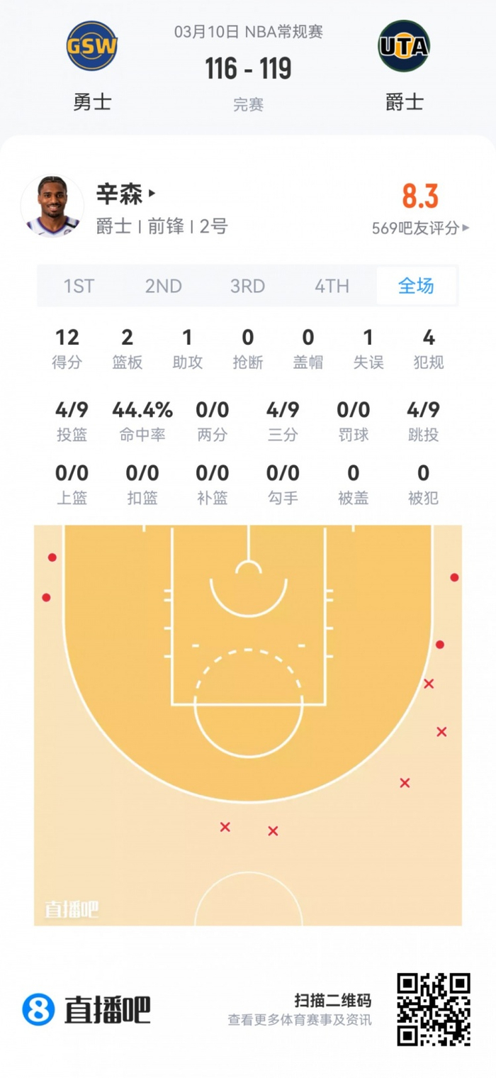 爵士落选秀辛森 登场27.8分钟