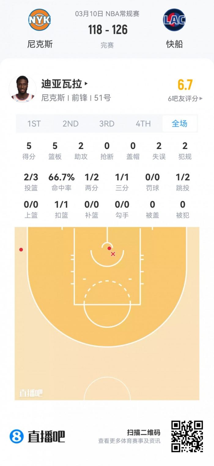 尼克斯次轮51号秀迪亚瓦拉 登场17.6分钟