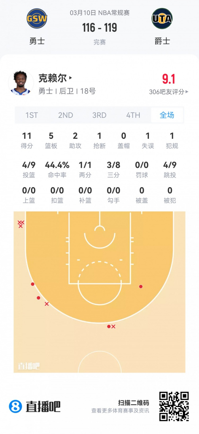 勇士落选秀克赖尔 登场16.7分钟
