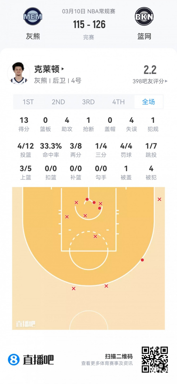 灰熊首轮18号秀克莱顿 登场29.1分钟