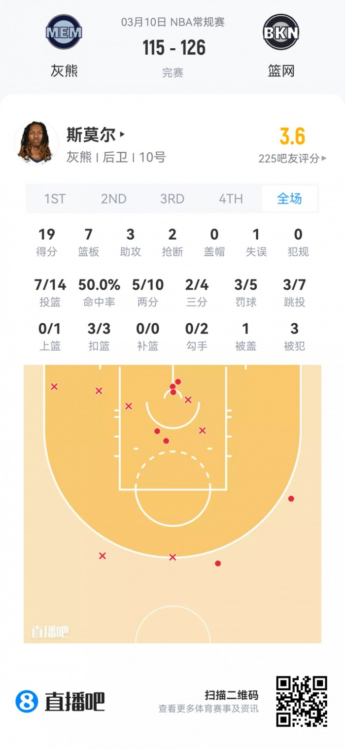 灰熊次轮48号秀斯莫尔 登场32.5分钟