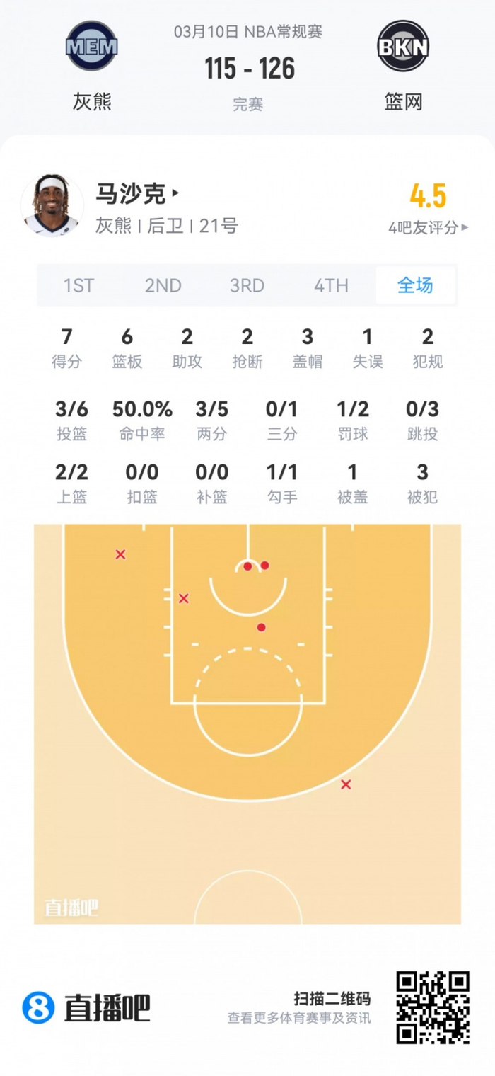 灰熊次轮59号秀马沙克 登场31分钟