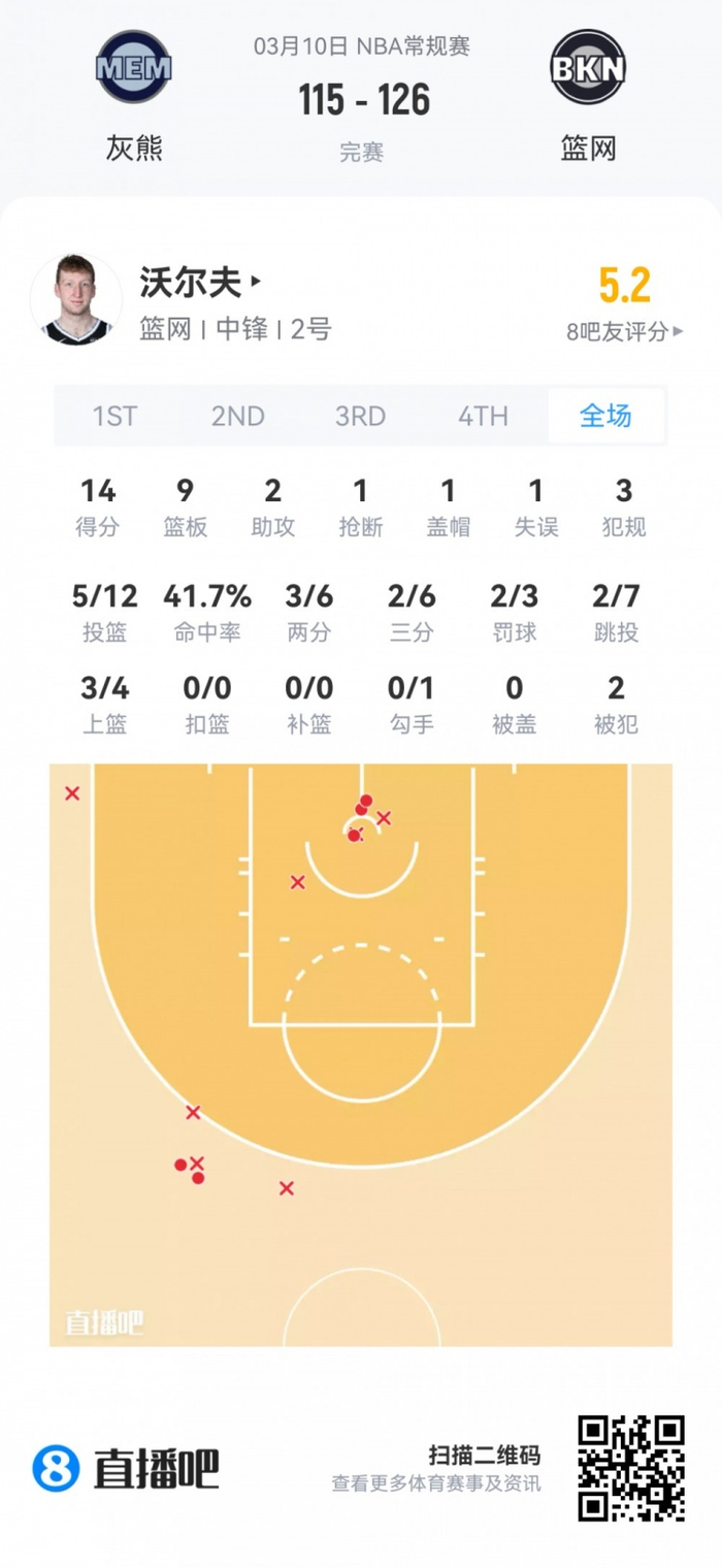 篮网首轮27号秀沃尔夫 登场27.6分钟