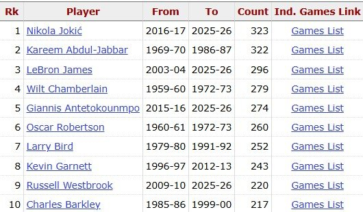 据统计,这是约基奇生涯第323场比赛至少20分10板5助,超贾巴尔(322场),独享NBA历史最多。