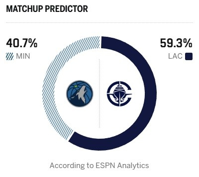 ESPN今日给出本场胜率预测,快船为59.3%占据上风,森林狼只有40.7%。