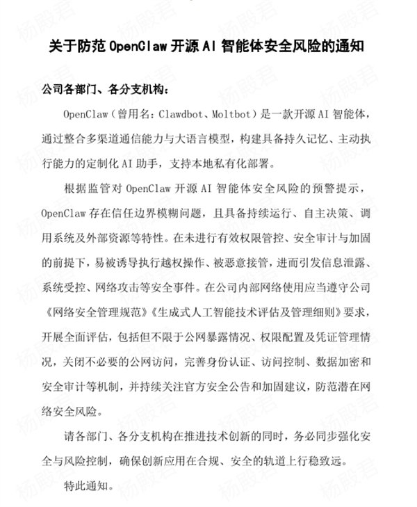 通知提到,根据监管对OpenClaw开源AI智能体安全风险的预警提示,OpenClaw存在信任边界模糊问题,且具备持续运行、自主决策、调用系统及外部资源等特性。