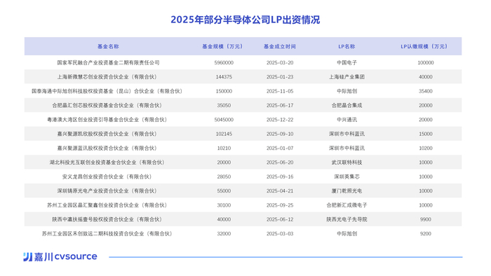 其中单笔规模最大的一笔,来自中国电子信息产业集团。2025年3月,该集团出资10亿元,参与国家军民融合产业投资基金(二期)。这一笔出资,占到了去年半导体LP整体出资规模的约四分之一。中国电子信息产业集团是国内电子信息产业的重要央企,旗下拥有16家控股上市公司,总资产达到4764.6亿元。在集成电路、计算产业、网络安全、数据应用以及高新电子等领域均有广泛布局。事实上,中国电子长期活跃在产业基金出资人名单中。其参与设立的国家级基金还包括:国家军民融合产业投资基金一期、国家集成电路产业投资基金(二期)、中国国有企业混改基金以及中央企业乡村产业投资基金等。在民营企业中,苏州光模块龙头中际旭创,是去年出资规模最大的半导体LP之一。2025年,中际旭创参与出资了两支基金。其一是与国泰海通合作设立的产业投资基金,认缴出资3.54亿元;其二是参与元禾控股旗下的“苏州工业园区禾创致远二期基金”,认缴出资9200万元。两次出资合计达到4.46亿元。如果把时间线拉长,中际旭创在LP中的活跃度也十分突出。投中嘉川CVSource数据显示,自2014年首次出资以来,中际旭创累计参投13支基金,通过基金间接投资了254家企业。合作最多的GP包括元禾控股、容亿投资等机构。此外,合肥新汇成微、深圳中科蓝讯、芯联集成三家公司在去年均出资3次,是出手次数最多的半导体LP。从GP来看,最受半导体公司欢迎的,多是产业型GP或长期深耕半导体赛道的投资机构。其中,华登国际是最受欢迎的GP之一。2025年共有6家半导体公司向其管理的基金出资。此外,中芯国际旗下的中芯聚源、上海国资背景的海望资本,也分别获得了4家半导体公司的出资。