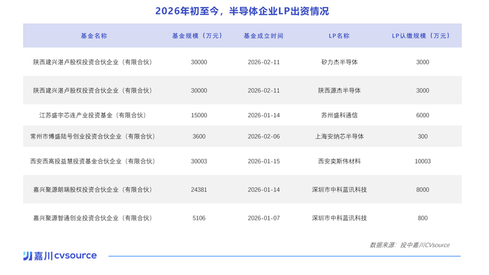 半导体公司下场做LP的消息最近越来越多。3月9日,富乐德公告称,将与金桥资本等合作方共同设立“上海浦东智能智造二期私募投资基金”。作为有限合伙人,其认缴出资额为4000万元。就在上周,兆易创新、长电科技等半导体公司,也相继宣布将出资设立股权投资基金。越来越多产业公司加入LP阵营,显示了当前一级市场募资端复苏的趋趋势。投中嘉川对2025年以及2026年前两个月的LP数据进行梳理发现,半导体公司已经成为其中LP群体之一。投中嘉川CVSource数据显示,以基金成立时间为口径,今年前两个月共有7支新设基金获得了半导体公司的出资,出资总额超过3.1亿元。