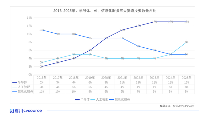 这些机构普遍深耕半导体产业多年,在产业资源和项目获取能力方面具有较强优势。半导体公司作为LP的出资,也在反哺整个行业的投资生态。自2020年以来,半导体迅速成为国内一级市场最重要的投资赛道之一。从2018年到2021年,半导体投资进入快速上升阶段。而在2023年以后,这一占比趋于稳定,大致维持在全行业约13%的投资数量占比(见下表)。