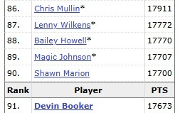 本场比赛之前,布克生涯总得分为17673分。本场第三节他拿到第28分后,布克的生涯总得分超越了球队名宿“骇客”马里昂,排名升至历史第90位。