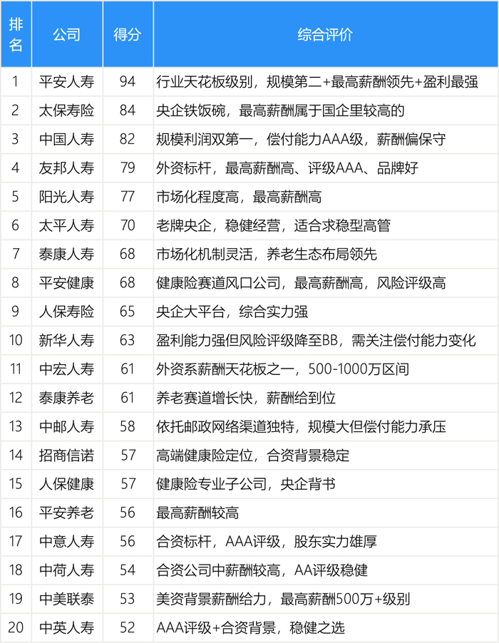 评选出了得分最高的20家寿险公司