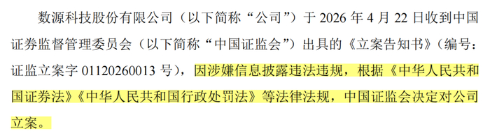 先看*ST数源,公司于2026年4月22日收到中国证监会出具的《立案告知书》,因涉嫌信息披露违法违规,中国证监会决定对公司立案。