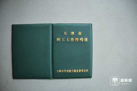 崔丽丽的职工工伤伤残证。潮新闻记者 于诗奇 摄