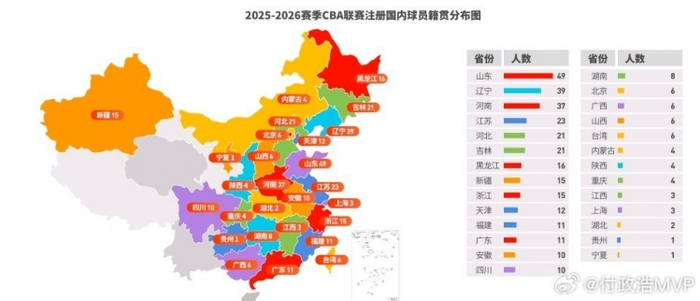 分别为山东籍49人、辽宁籍39人、河南籍37人、江苏籍23人、河北籍21人、吉林籍21人。 以上六省籍贯的球员约占CBA现役球员的55.2%。