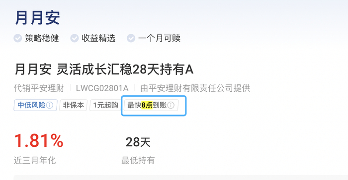 在此之前,工银理财、北银理财、光大理财等已推出相关产品,信银理财则在官方App中明确标注“支持T+0.5功能,赎回到账早半天”,平安理财代销产品的到账时效进一步提升至8点前,成为目前行业内的较快水平。